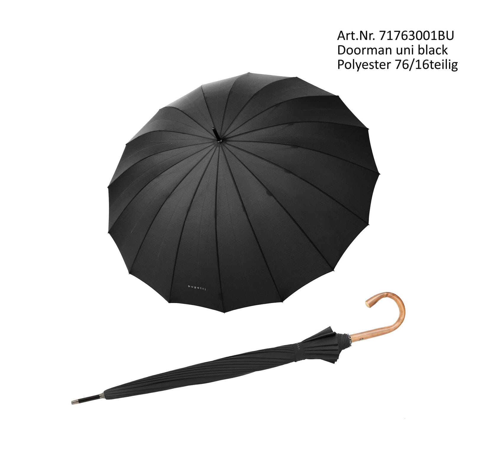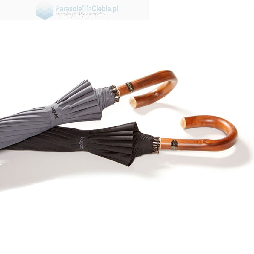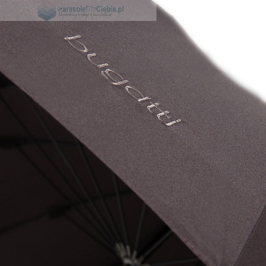 Klasyczny parasol marki Bugatti - wysokiej jakości ekskluzywny produkt przeciwdeszczowy. Jest to parasol typu VIP, zwany też "rządowym" lub "prezydenckim" ze względu na klasyczny kształt i kolor. Długi męski parasol otwierany manualnie. Wygodna, przyjemna w dotyku drewniana rączka ze złotym emblematem "bugatti". 16 - klinowa czasza z poliestru, solidny trwały stelaż, spięcie czaszy szerokim paskiem na guzik. Kolce i czub z tworzywa. Na czaszy widnieje dodatkowo haftowany napis "bugatti"