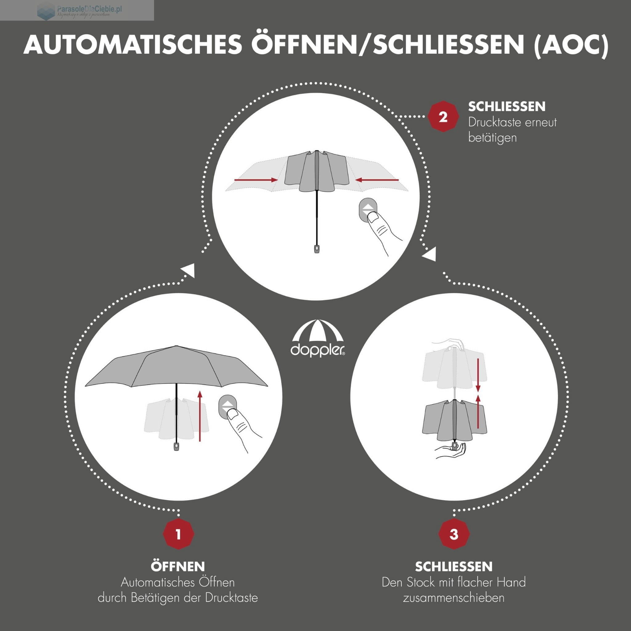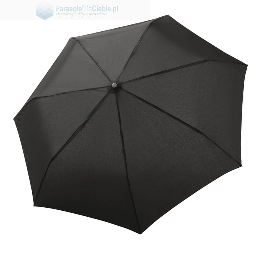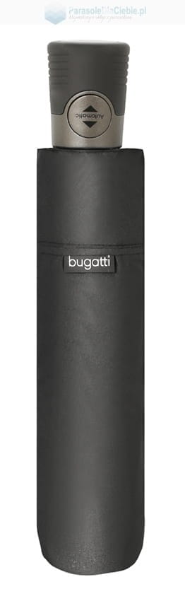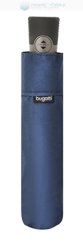 Lekki i poręczny parasol marki Bugatti, która działa pod szyldem marki DOPPLER. Otwierany i zamykany automatycznie. Posiada niewielką, krótką, perforowaną rączkę. Kolce parasola są metalowe. Czasza w jednolitej barwie, do wyboru dwa klasyczne kolory: czarny oraz granatowy.