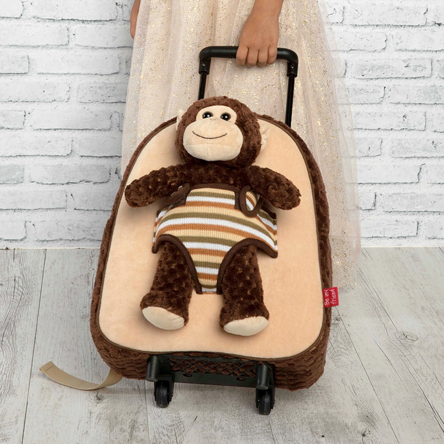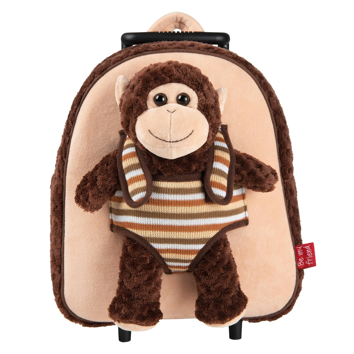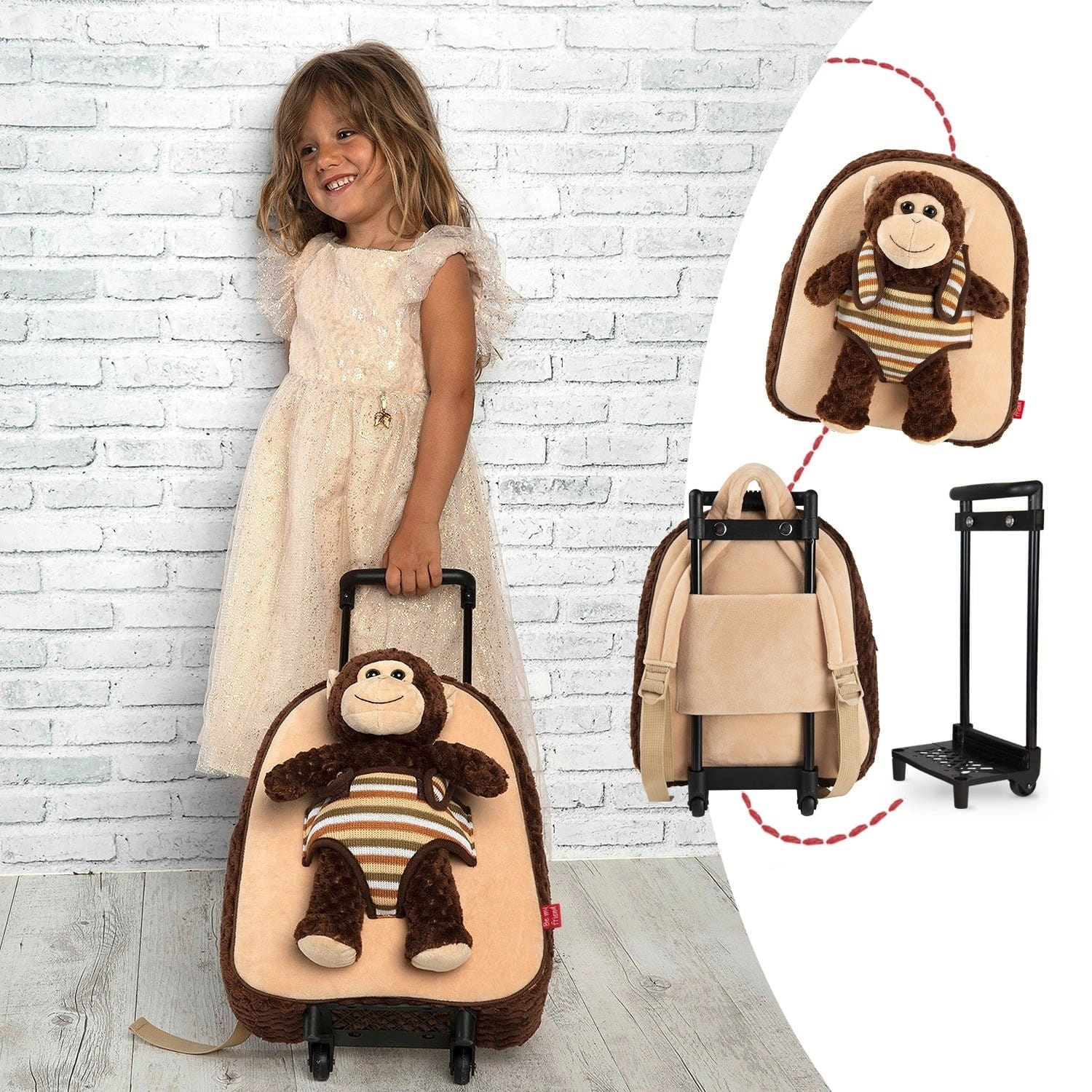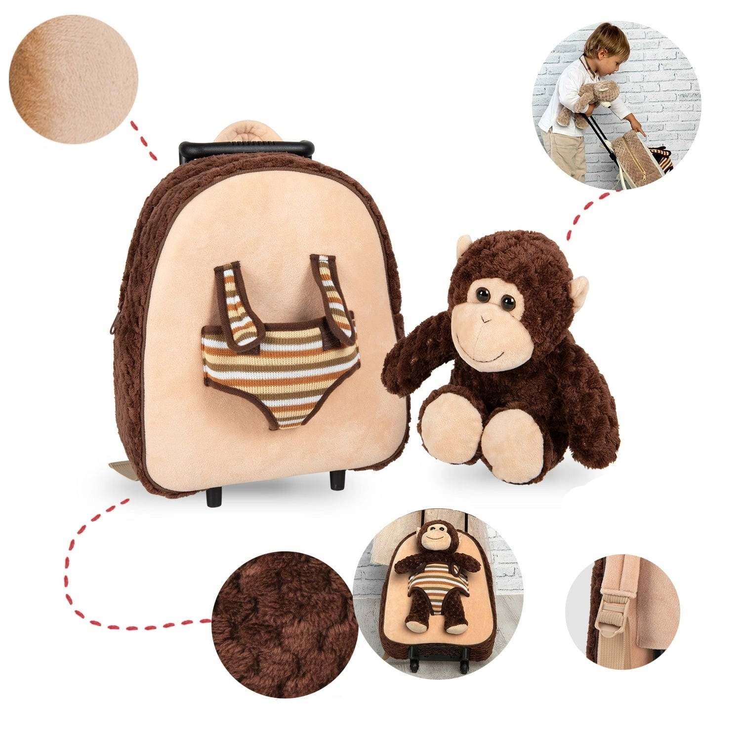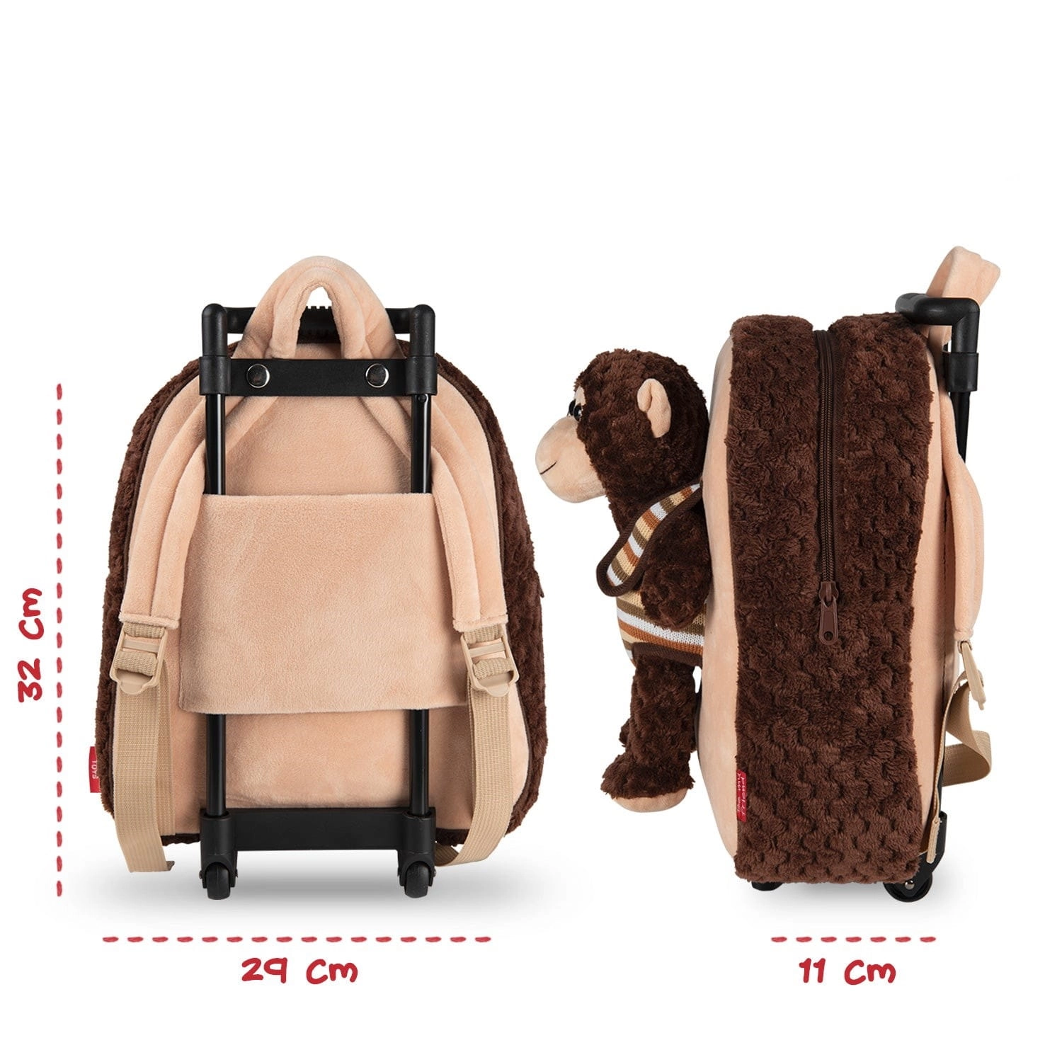 Pluszowy plecak na kółkach z uroczym i miękkim pluszową małpką. Maskotkę można zdjąć i wykorzystać jako zabawkę, dzięki czemu będzie fantastycznym towarzyszem przygód dla Twojego dziecka, które zawsze będzie chciało nosić go ze sobą.