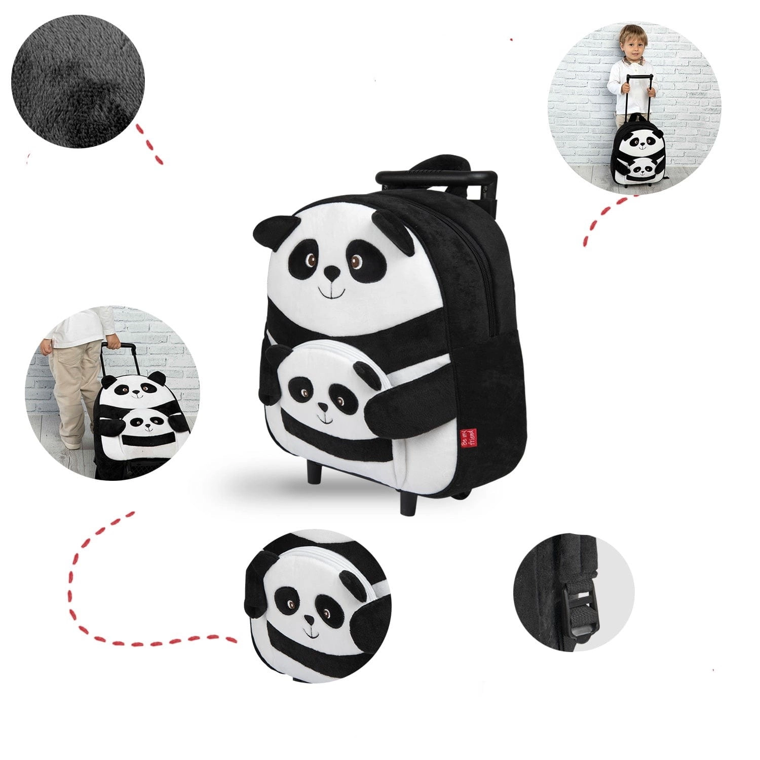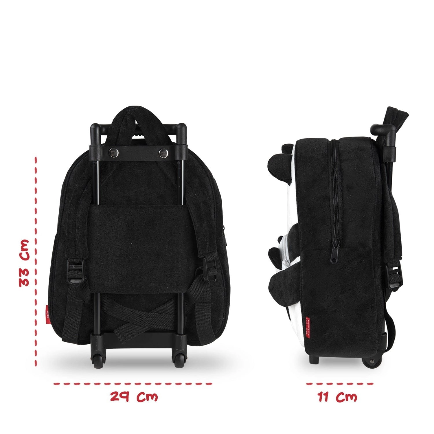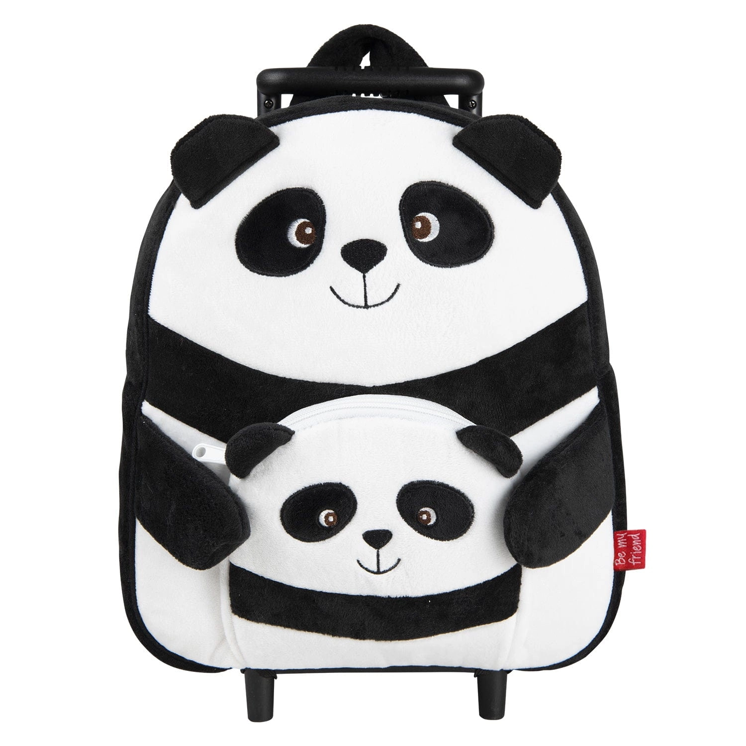 Pluszowy plecak na kółkach z uroczym wizerunkiem pandy z jedną komorą główną i mniejszą przednią kieszenią na zamek. Duża komora pozwoli na zabranie ze sobą wszystkich najpotrzebniejszych rzeczy, a małą będzie idealna dla drobnych przedmiotów.