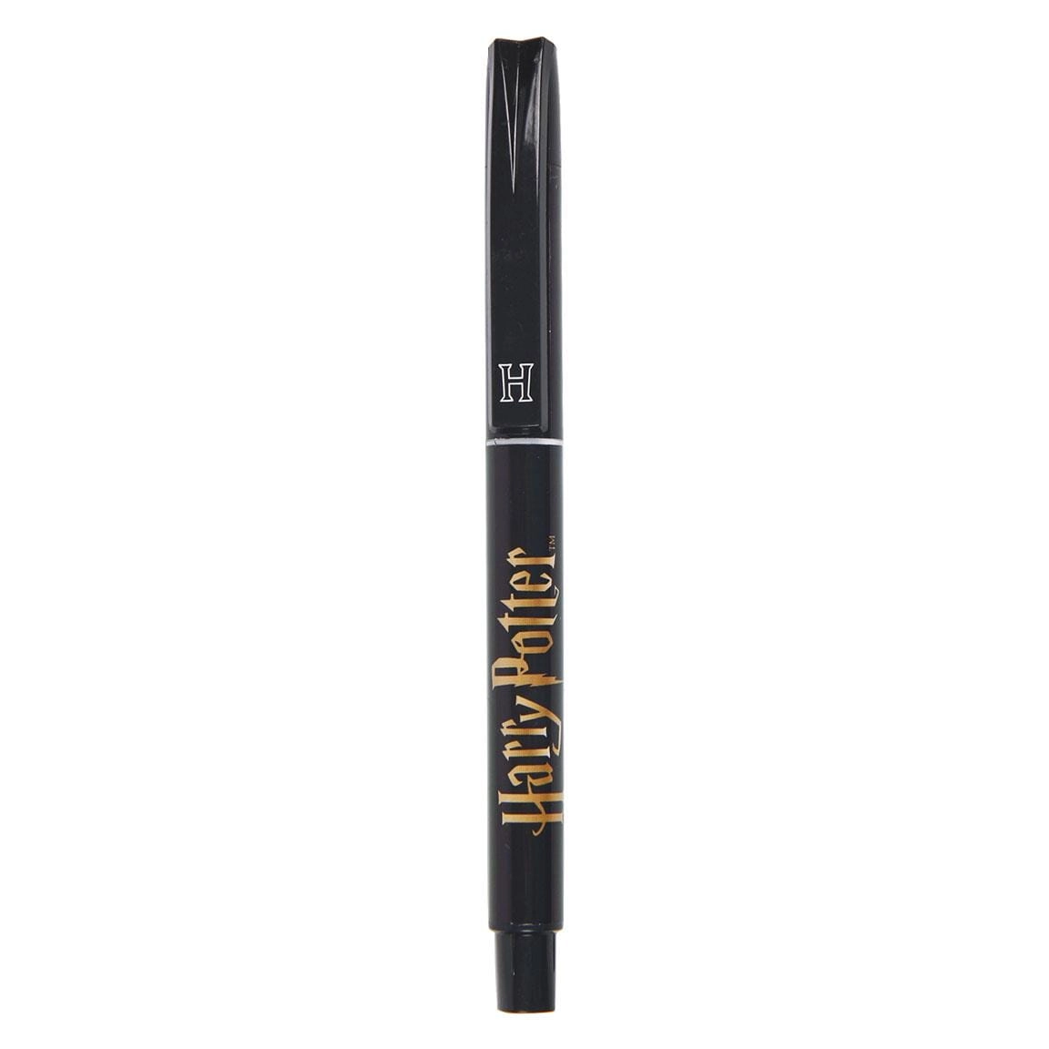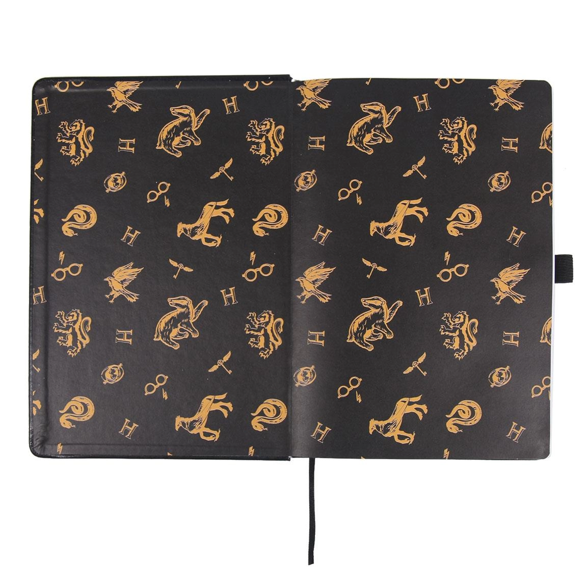 Luksusowy notatnik w twardej oprawie pokryty jest sztuczną skórą i ozdobiony złotym herbem Hogwartu. Notatnik posiada wszytą wstążkę służącą jako zakładka, pętelkę na długopis oraz zamykany jest złotą gumką. Długopis ze złotym logiem Harry Potter idealnie dopełnia całość.